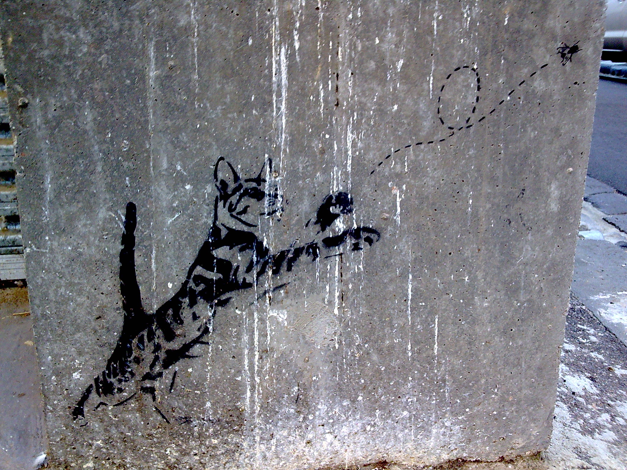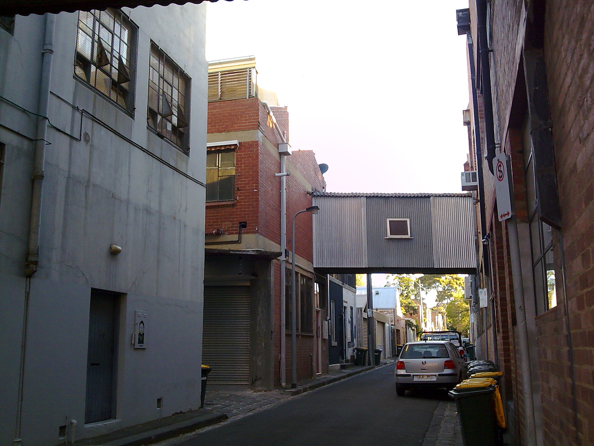 This is my dream house. The red brick one with the silver room over the street. It’s in Little Gore St, Fitzroy, just around the corner from my work (equally good as living across the road from the Rose). It’s a very large warehouse conversion with a top floor consisting of the main bedroom with ensuite and a massive terrace with amazing views of the city. I have pics saved from the real estate advertisement when it was for sale about a year ago… they are at home, sleeping on my harddrive in the shade of my bed. I’ll put them up when I can get around to it, but in the meantime, these are just a couple of pics to show you where my graffiti kitteh avatar thingum comes from (look in the URL spacebar, it’s the little square on the left.) It’s on the grey corner wall in between the roller door and the red brick.