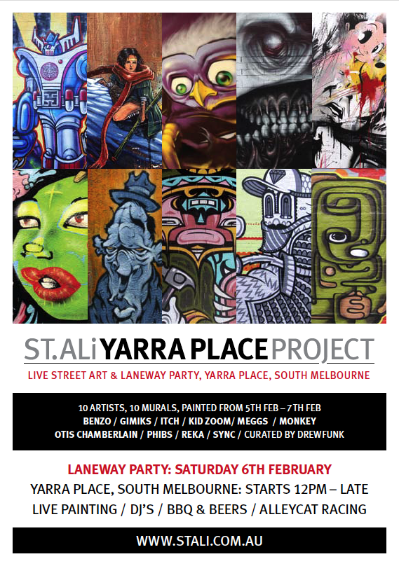“The ST ALI LANEWAY FESTIVAL is about celebrating Melbourne’s street art and culture and bringing it to unique settings and surrounds to be appreciated by the community. Come join in the party with street artists at work transforming the alley into works of art – DJs – alleycat racing – beers – snags.”