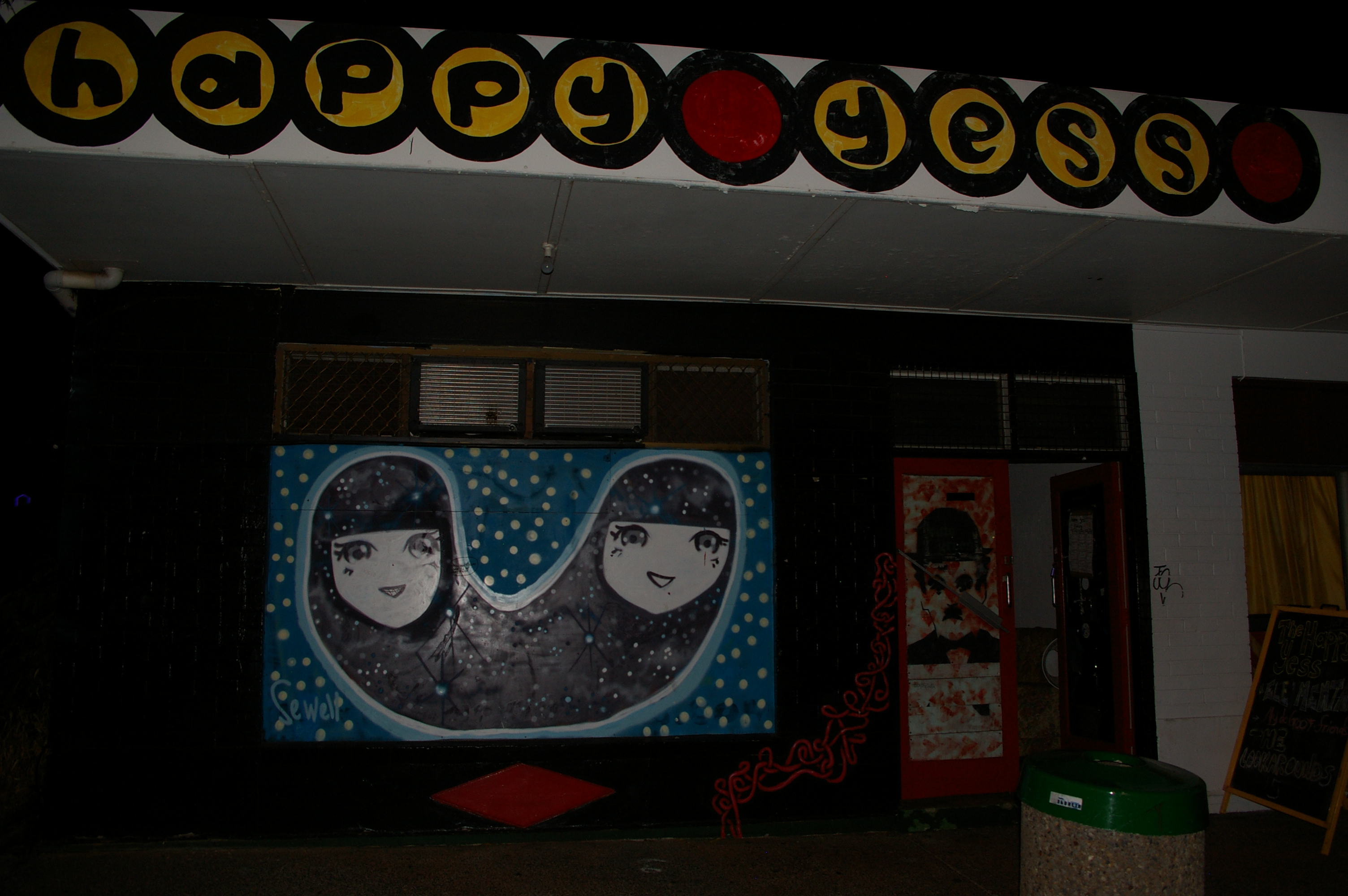 This is the same artwork I saw on the old Yorkshire Brewery in Collingwood, awhile ago (it’s been covered with new graf now.) By Matt Sewell? Is this correct? The version on the Collingwood site was a lot neater technically than this version… but I still got a kick out of seeing it in Darwin! On the front wall of the Happy Yess live music club.