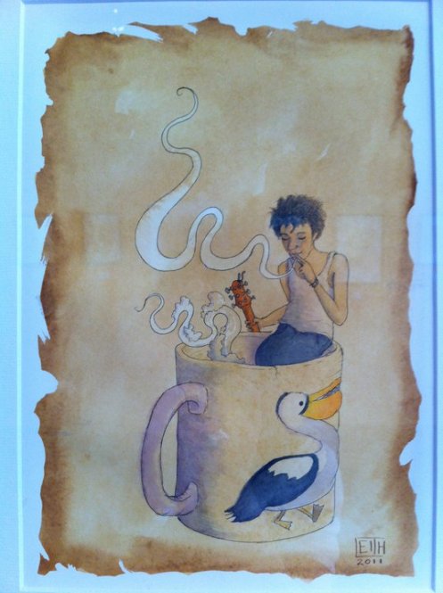 ‘The Marvellous Misty Mystics’ is a series of finely inked and watercoloured pieces, all based around the theme of tea drinking and the worlds you get lost in when you drink tea. Or at least, the worlds Leith gets lost in when Leith drinks tea.  One of his pieces was of Damo – an apt subject, Damo being quite the tea-drinking, musical daydreamer himself.