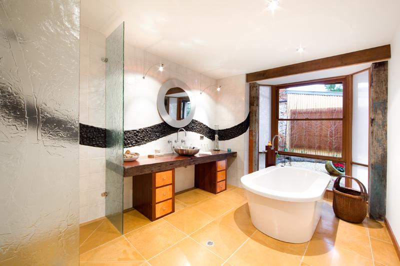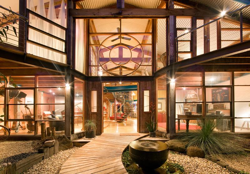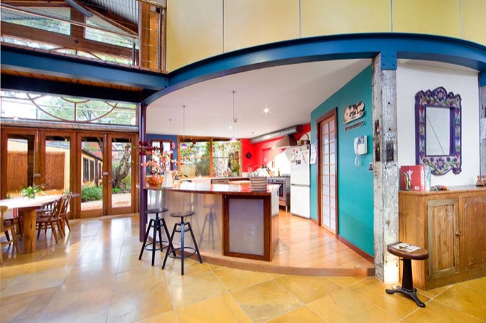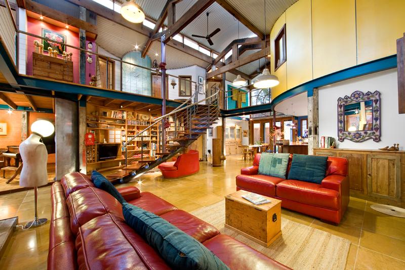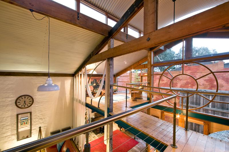 • I love wood! The staircase is lovely and the bookcase behind it is awesome! I think I also like the place overall because the corrugated iron, ceiling fans and plentiful balcony space remind me of (newer) Darwin houses. Just needs some louvers 😉