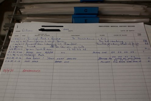 Last weekend I went on a little roadtrip and found such a place. A factory that went into liquidation several years ago, this place had been partially demolished but still had workers’ equipment, personal files, and even photographs of a fishing trip they went on still stuck on a (semi-demolished) wall. Some of the files dated back to the 40s and 50s, with some of the workers’ birthdates listed as being in the late 1800s. The files had been neatly typed on a typewriter and were still in their filing cabinets. How does a company just leave this stuff and walk away when they close?