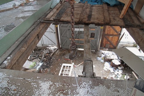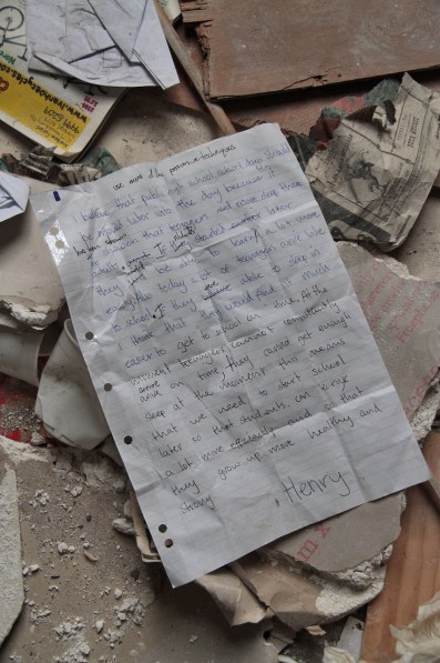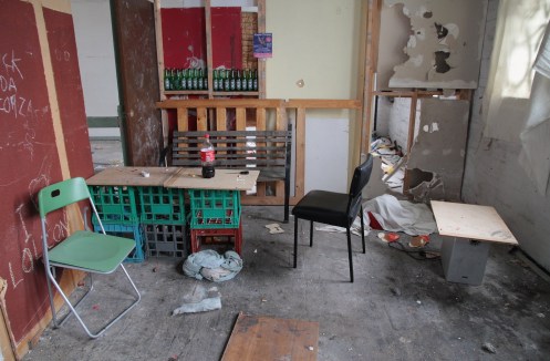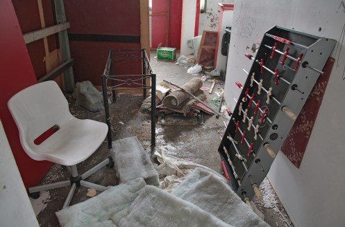 I’d just tagged along with Maka who was scoping out a potential new place to paint.  It was small but had some interesting features – aside from the mail on the ground (I’m always fascinated by the human elements to abandoned places), there was a makeshift bar upstairs, a disused foozeball table, and a hanging hook above a hole in the floor(!).  Lots of good walls for painting, too.