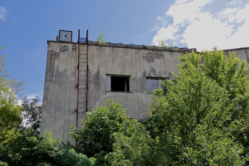 Our next stop was the pool/gym complex. Those of you who have looked at photos of Pripyat online will probably recognise the pool. But we couldn’t see it, because we weren’t allowed in the building! There wasn’t much to see from the outside, as the pool is on the second floor and the building was surrounded by trees. The clock on the top of the building read 1:24, the exact time that the explosion occurred in 1986, but after looking at other peoples’ pictures since coming back from Pripyat, I’ve realised that the time has changed on at least several occasions, so someone obviously got up there and changed it to 1:24.