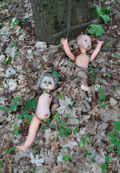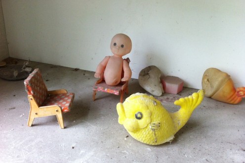 The front yard of the school was overgrown and quite thick with trees. Dismembered dolls and rusty toy trucks were lying in the grass on the way to the front entrance.