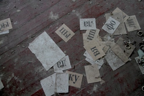 There were a lot of childrens’ journals and workbooks scattered around, on tables and on the floor; and I could read some of what they had written. There were Cyrillic alphabet cards all over the floor too, and a medicine cabinet with empty and semi-empty bottles in it.