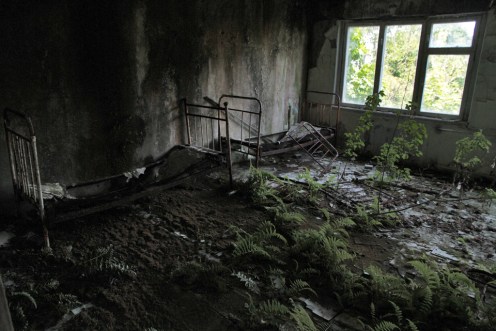 We explored another neighbouring building, a multi-storey construction which looked like it was probably a hotel or an apartment block. We couldn’t be sure though, as most of the rooms had been looted and were empty. We did find what looked like a dentist’s chair in one of them, as well as quite a number of rusted bed frames. It was interesting to see how much nature was reclaiming the area – plants grew wildly throughout the buildings, including on the rooftops; not just on the ground outside.