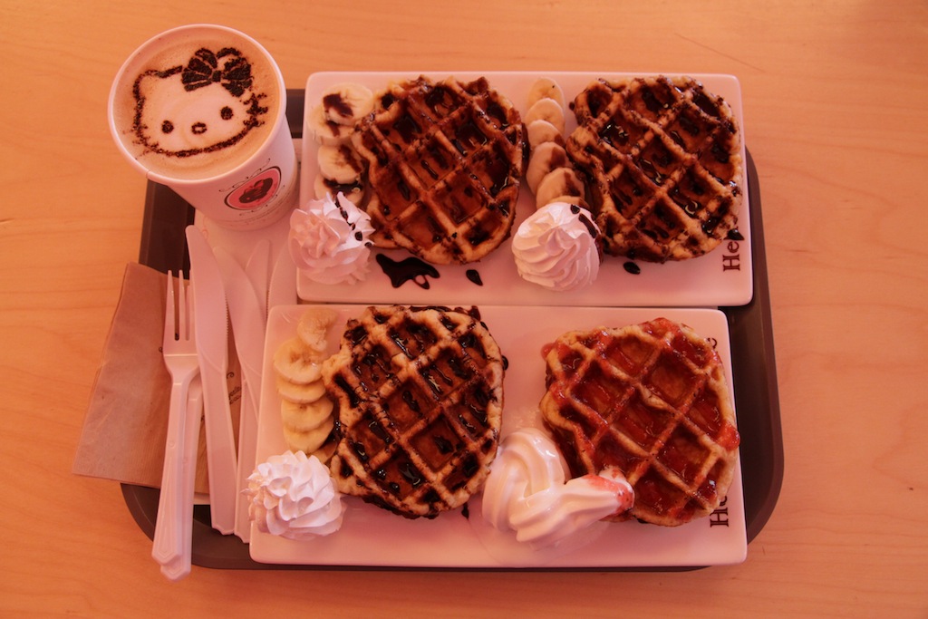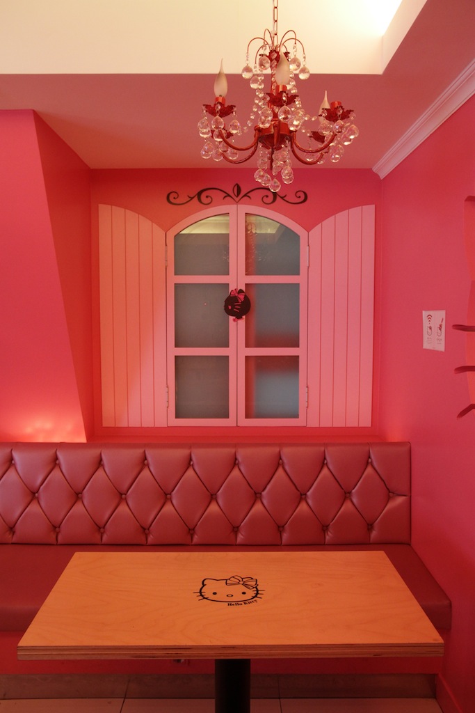 The cafe is decked out in pink with Hello Kitty motifs everywhere, complete with pink furniture and chandeliers. The cakes and sweets are all shaped in Hello Kitty faces and even the coffees have Hello Kitty on top.